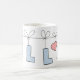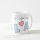 Taza linda con nombre personal Ella con letra de lunares azules colgando de una cuerda junto con un corazón rosa.