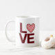¡Guarde el frente y el centro del amor con esta taza de café maravillosa! Ofrecido en un tema rojo oscuro. También disponible en otros colores. Mire en nuestra tienda (MessageMugs), o busque para la taza del AMOR.
