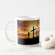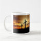 Taza de café que ofrece 3 cruces silueteadas contra el sol naciente y la escritura del evangelio de Juan.