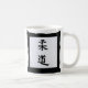 Taza blanca marcada con los símbolos negros del kanji que denotan judo en un marco oriental negro del estilo.
