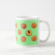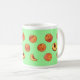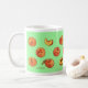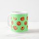 Taza con diseño alegre del dibujo del melocotón. Fondo verde. Esta taza de café con 17 diversos dibujos originales del melocotón aclarará su mañana y tarde. Hace un gran regalo para sí mismo u otros para cualquier ocasión.