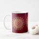El amor delicado es una pintura a mano de la mandala. Ofrece una mandala compleja del oro en un fondo rojo multi-hued. El diseño se repite alrededor de la taza así que puede ser disfrutado de cualquier ángulo.