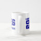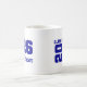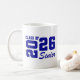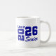 La taza de café de cerámica para graduado senior se muestra en un diseño de color azul real y blanco.