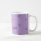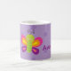 Taza personalizada que ofrece una mariposa colorida con un fondo floral púrpura hermoso. Diseño lindo y de la diversión para el special para los chicas. Regalo con monograma de encargo.