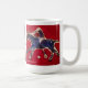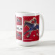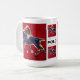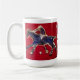 Caballo y jugador pintados de cerámica azules del polo en fondo rojo. Taza blanca. Arte de encargo por StudioNancyAlcott.