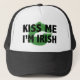 Béseme que soy gorra irlandés. La frase me besa que soy irlandés en la fuente céltica blanca impresa sobre una impresión verde del beso. Un gran regalo para el día, los nacionales irlandeses, o el cualquier persona de St Patrick orgulloso de su herencia irlandesa.