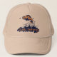 Naranja de peces voladores estilizados y gorra de arte de dibujo azul oscuro. Lee sólo pescando. Un regalo ideal para un aficionado a la pesca con mosca. Arte original y diseño de Sarah Trett.