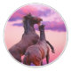 Fotografía de dos caballos salvajes (sementales) criando o jugando durante el amanecer, mostrada en un pomo de cerámica.