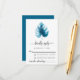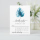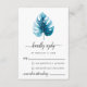 Diseño moderno de tarjetas RSVP con ilustracion de hojas de monstera de color agua sobre un sencillo fondo blanco. El lado inverso de la invitación está en un color azul profundo.