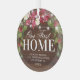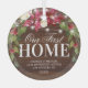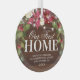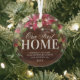 Nuevo ornamento casero de navidad de vidrio rústico con fondo de efecto de madera, elegante acuarela navideña y follaje, hilos de luces, el bonito dicho "nuestra primera casa", su nombre, su nueva dirección y el año.