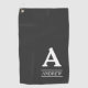 Estas características del diseño simples y elegantes de la toalla del golf un monograma personalizado/una letra inicial, junto con un nombre adaptable entre las líneas, en un fondo gris, podría ser un gran regalo para alguien que goza el jugar de golf.