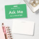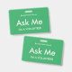 Marcas verdes de mar brillante "Pregúntame" para voluntarios, profesores, docentes, guías, organizadores de eventos para eventos especiales, como bodas, ferias de artesanías, espectáculos caseros y de jardín, eventos caritativos, negocios y funciones corporativas. El color de la tipografía es marfil pálido, lo que le da a esta insignia un aspecto moderno.