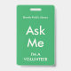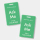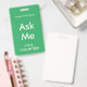 Marcas verdes de mar brillante "Pregúntame" para voluntarios, profesores, docentes, guías, organizadores de eventos para eventos especiales, como bodas, ferias de artesanías, espectáculos caseros y de jardín, eventos caritativos, negocios y funciones corporativas. El color de la tipografía es marfil pálido, lo que le da a esta insignia un aspecto moderno.