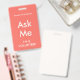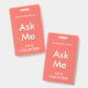Brillantes insignias de color rojo coral "Pregúntame" para voluntarios, profesores, docentes, guías, organizadores de eventos para eventos especiales, como bodas, ferias artesanales, espectáculos caseros y de jardín, eventos caritativos, negocios y funciones corporativas. El color de la tipografía es marfil pálido, lo que le da a esta insignia un aspecto moderno. ¡Fácil de personalizar!