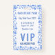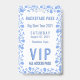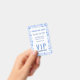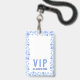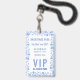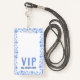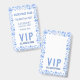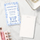 Una tabla de invitados que contiene un pase VIP que anuncia el evento con una vuelta en blanco para escribir el nombre y el número de la tabla de su invitado. La insignia es de plástico, por lo que se recomienda un marcador permanente como una punta fina Sharpee, y cada insignia debe secarse completamente antes de manipularse.