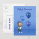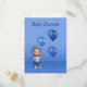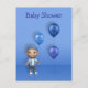 Un bonito diseño de una ducha de bebé en tonos azules, un niño con globos azules en un fondo azul.