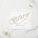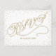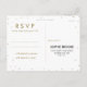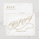 Pequeñas estrellas doradas purpurinoso brillan en nubes de confeti alrededor del borde de esta hermosa postal de respuesta dorada y blanca, con un guión de efecto purpurina dorado que dice "RSVP". Agradable, moda y encantadora. Perfecto para una aventura fabulosa. Obra original de Colleen Michele. Por favor, tenga en cuenta que no hay un efecto real de purpurina de oro o hoja de oro en las estrellas y el guión; en esta invitación no se utilizará ningún purpurina, hoja de oro o tinta metálica.