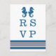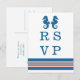 Elegante y clásico Postcard de respuesta Boda de caballito de mar náutico con un par de caballitos de mar sencillos y un conjunto de rayas en azul marino oscuro y coral. Esta tarjeta postal con temática náutica RSVP se puede personalizar fácilmente con los detalles de tu boda. Para obtener más opciones de personalización, haga clic en el botón Personalizar.