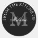 De la cocina de pegatinas de monogramas redondos. Elegantes etiquetas de comida casera en blanco y negro para hornear y cocinar. Añade tus propias letras iniciales de nombre. Tipografía de época y escritura. Diseño monogramado con clase con fuentes de moda. Grandes sellos de bolso para favores de boda, pasteles, galletas de Navidad, pastelitos, dulces de cumpleaños, obsequios de vacaciones, etc.