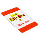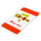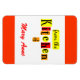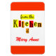 Un retro personalizado "Desde la cocina de" con escritura y lindas letras kitsch en negro contra bloques de color de rojo, naranja y amarillo, con bordes rojo arriba y abajo.