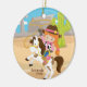 Personalice y pequeño ornamento rojo lindo anticuado del navidad del jinete de lomo de caballo de la vaquera del pelo fijado en un fondo de la arena y de la montaña con un cactus verde. Un regalo del navidad de la maravilla seguro que se atesorará durante muchos años para venir.