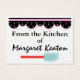 Utilizando tarjetas de visita (algunas regulares y algunas regordetas), estoy diseñando tarjetas que siempre he disfrutado teniendo a mano: 1. Tarjetas de envoltorio de regalo para meter regalos o cestas de regalo, y 2. Tarjetas "DE LA COCINA DE" para hacer lo mismo cuando le das a alguien algo especial de tu cocina. Ambos son un toque de clase, y siempre he tenido buenos comentarios en las tarjetas de mis destinatarios. Antes de Zazzle, solía pedirlos a una empresa muy cara. Incluso pinto un sello con mi monograma para ir sobre el tejido o el envoltorio de plástico. Estaré encantado de decirte dónde conseguí eso. La forma en que lo veo es si voy a dar un buen regalo o pasar el tiempo cocinando, vale la pena envolverlo con un toque de acabado especial, así que... ¡diviértete con eso! Verifica las diferentes existencias de papel para tu preferencia y precio! Gracias, Sharon Rhea Ford (www.zazzle.com/sharonrhea*)