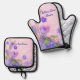Bring romance and elegance to your kitchen with this Personalized Floral Oven Mitt & Pot Holder Set. Featuring the heartfelt phrase “Where Love Grows” alongside delicate blue wildflowers on a soft pink background, this coordinating set transforms everyday cooking into a special and thoughtful experience.