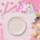 Plato rosa pastel con flores blancas, perfecto para una fiesta de bebé o una ducha de novia. Diseño simple y elegante con detalles femeninos. Coordina con nuestra Colección de Ducha Baby in Bloom.