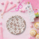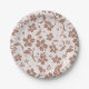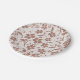 Plato redondo con un patrón floral marrón sobre fondo blanco, mostrado desde dos ángulos: vista frontal y ligeramente inclinada. El diseño es intrincado y elegante.