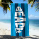 ¡PLAYA POR FAVOR! Este diseño fresco y único presenta una tipografía moderna que se asemeja a la forma de una tabla de surf sobre un fondo rayado. Utilice la herramienta de diseño para cambiar los colores de la banda.