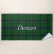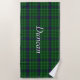 La elegante toalla de playa se sirve en el clásico trenzado de lona de tartán de Duncan, de color azul y verde escocés. Personalice el texto blanco grande, en el medio, para que se adapte a sus necesidades.