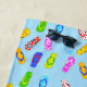 Esta bonita toalla de playa tiene un adorable patrón de sandalias de chanclas con colores y motivos diferentes en un fondo azul claro.