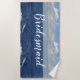 La temática de la dama de honor en la playa. La dama de honor está escrita en blanco. El fondo tiene un océano azul bonito con olas de espuma blanca y un cielo azul claro con grandes nubes blancas onduladas. Toallas de playa para la fiesta de bodas. Diseño fotográfico original © TamiraZDesigns.