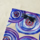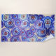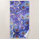 Toalla de playa con círculos morados, flores acuáticas abstractas.
