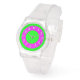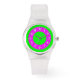 Reloj analógico de moda en verde y magenta, números blancos con sombra negra, correa esporádica rosa. También se puede elegir una correa blanca. Este reloj es resistente al agua a 30 metros, un accesorio de armario elegante o un reloj de trabajo duro pero elegante, e incluso mantiene el tiempo.
