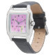Un reloj de bonito floral con fondo de pintura acuarela que muestra una flor abstracta. Cada reloj está disponible en diferentes diseños y puede ser personalizado con el nombre del propietario.