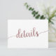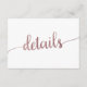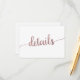 Esta tarjeta de inserción de detalles de boda dorado rosa es perfecta para un boda simple. El diseño presenta una hermosa caligrafía de Relieve metalizado de oro falso rosa. Se puede utilizar como tarjeta de detalles de una fiesta de boda o de soltera. Nota: Este diseño no tiene Relieve metalizado de oro rosa real. Es un gráfico de alta calidad hecho para que parezca oro rosa sucio.