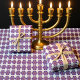 Gran patrón para envolver tus regalos de Hanukkah. Menorah púrpura sobre fondo blanco.