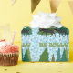 Moose de toro de silueta y alce con sombreros de Santa Cruz rojos y blancos paseando por el bosque. Los copos de nieve repitiendo en azul y verde azulado sin inconvenientes crean un fondo de invierno. El texto dice: "Sé feliz". Arte caprichoso de Melissa J Barrett