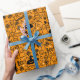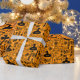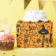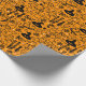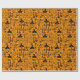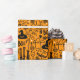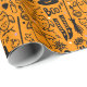 Papel envuelto con un diseño minimalista moderno para Halloween, un patrón de siluetas de calaveras, fantasmas, telarañas, una silueta de un gato, calabazas sobre un fondo naranja.
