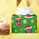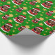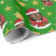 Navidades envolviendo papel con el ilustracion de un lindo sonriente feliz chica negro con el pelo largo, lleva disfraz rojo y blanco de Santa Claus y tiene un regalo; con plantilla de texto editable para tu nombre o mensaje, Navidades diseño de vacaciones con fondo verde