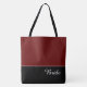 Esta encantadora bolsa tote de moda muestra la palabra "Novia" en color de texto blanco sobre negro con la parte superior de la bolsa tote en Merlot personalizado. Tiene mucho espacio para texto personalizado. Los gráficos y el texto están en ambos lados de esta bolsa tote. Asa negra. Personaliza aún más o compra como se muestra.