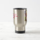 La taza de café del viaje con la acuarela original de dos corazones en un lado y la cita "café y amor son las mejores cuando son calientes!" en el lado opuesto