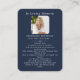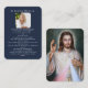 Honre la memoria de un ser querido con esta hermosa tarjeta de oración divina católica de misericordia, que presenta la poderosa imagen de Jesús con rayos de luz roja y pálida en la parte posterior de la tarjeta. Front of card incluye una foto de su ser querido con nombre y fecha junto con la tesorada Oración de la Divina Misericordia en un fondo azul clásico. Esta tarjeta de oración es perfecta para los funerales y los monumentos. Familias y amigos pueden llevarla en una billetera, Biblia o un libro de oraciones como un tesoro. Personalice fácilmente el nombre, las fechas y un mensaje especial de su ser querido. Ideal para funerales católicos, wakes y ceremonias de recuerdo, este clásico diseño de tarjetas de oración hace una silueta duradera de oración y confort.