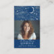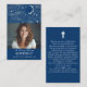 Tarjetas de Oración Starry Night Memorial. Estas pequeñas tarjetas funerarias azules con un cielo lleno de estrellas y la luna proporcionan un recuerdo memorable que es ideal para conmemorar a tu ser querido en cualquier funeral o celebración del servicio de vida. La parte delantera de la tarjeta presenta elegantemente el texto "En memoria amorosa" debajo de una fotografía, junto con el nombre y las fechas. Al revés, la tarjeta está diseñada para acomodar un poema hecho a medida, ofreciendo la opción de personalizarlo o reemplazarlo por completo con palabras de su elección.