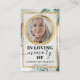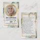 Tarjeta de oración totalmente personalizada con una cruz decorativa en la parte trasera y versos de oración que se pueden personalizar. La tarjeta de oración viene con un personalizable y una foto personalizada y con un nombre personalizado y fecha del funeral. El diseño presenta un estilo de escritura a mano/caligrafía junto con fuentes elegantes y elegantes.