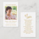 Dimensiones de la tarjeta de visita: Tarjeta de escritura simple para oraciones fúnebres de 3,54" x 2,165". Personaliza tu foto, nombre y fecha favoritos. El diseño de la tarjeta es un elegante corazón cruzado de oro y un mensaje personal que puede ser personalizado para adaptarse a sus necesidades únicas.