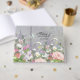 El ilustracion de un elegante jardín de flores silvestres de la cabaña inglesa con mariposas azul acuático se extiende por todo el libro de huéspedes para un diseño impresionante, colorido y elegante. Personalizado con los nombres de la novia y del boda Groom y un fondo rústico de carpintería gris pintado a mano. Derechos de autor artísticos, Audrey Jeanne Roberts, todos los derechos reservados.
