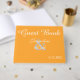 Frescos colores de fruta de verano temática boda en naranja y frambuesa. Personalice los nombres de la novia y del novio y el boda de citas con escritura blanca en la portada. Personaliza el revés con dos corazones y las iniciales monogramadas de la pareja escritas en su interior. Nuestra historia de amor está escrita en la columna vertebral de un libro en texto negro contra fondo blanco. Haz que los invitados bodas firmen tu libro de bodas como un libro de keepsake encantador. Diseño original de TamiraZDesigns.