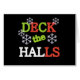 El texto rojo, verde y blanco con copos de nieve blancos dice "Deck the Halls" en camisetas de vacaciones, bolsas de té, tazas, imanes y más.